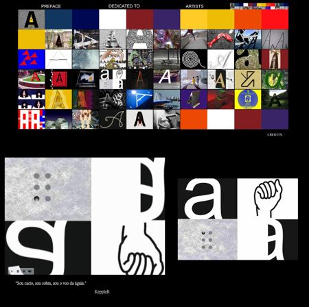 Projeto concebido por uma artista brasileira de web arte, AlphaAlpha é composto por 365 letras “A”, além de mais uma para anos bissextos. Trata-se de uma iniciativa coletiva e híbrida onde 38 artistas brasileiros e estrangeiros ocupam-se em criar instâncias estéticas para um mesmo signo – a primeira letra do alfabeto. Há uma aproximação de diferentes linguagens como a fotografia, a animação e a poesia digital, trazendo um universo múltiplo de abordagens. O seu caráter coletivo nos remete também a pensar a rede como o espaço dos intercâmbios artísticos – a web é suporte de trocas e colaborações entre artistas, ainda que necessariamente não trabalhem com uma linguagem específica da web. Por fim, vale observar que este projeto nos conduz a refletir sobre a própria história da escrita e sua relação com diferentes linguagens.