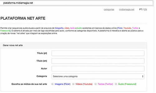 Plataforma online que se apropria e ressignifica conteúdos disponíveis na Internet sob a forma de imagens, vídeos, áudio e texto. Conforme texto da artista, “diante da sensação de infinitude das imagens, textos e todo tipo de registros de dados online realizados atualmente, a Plataforma Net Arte se coloca como um agenciador desses arquivos, ativando novos modos de ver e de elaborar os seus sentidos”. No site, após preencher parâmetros desejados, os resultados dão origem a produtos audiovisuais a serem exibidos ininterruptamente, em um fluxo poético alusivo à torrente informacional própria da Internet. O projeto contou com a colaboração de Eduardo Omine.