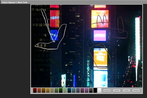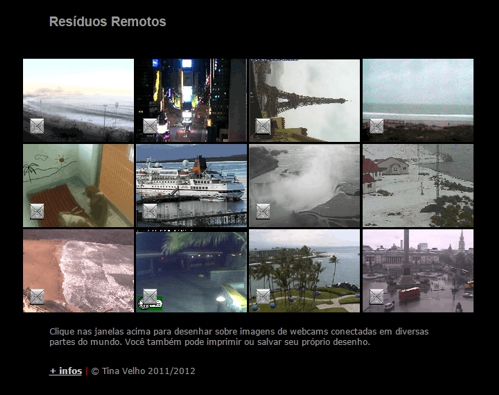 Tina Velho possui vários trabalhos baseados em imagens de webcams pelo mundo, se apropriando do imaginário destes dispositivos. Aqui a artista reune webcams de diversas partes do mundo – de outros sites da Internet – como um panorama de um mesmo instante no tempo em diferentes espaços. Como a própria artista diz, as webcams são como múltiplos olhos continuamente abertos. Neste trabalho especificamente, os visitantes podem criar interferências nas imagens por meios de ferramentas de desenho.