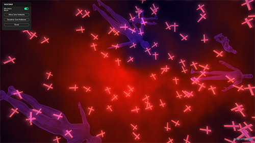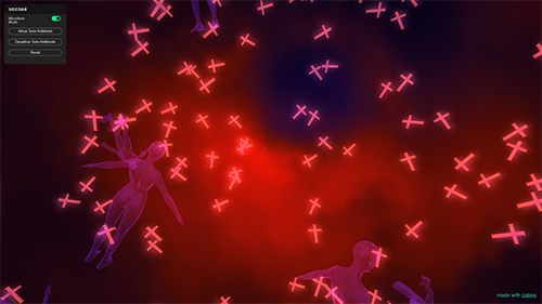 A pandemia de COVID-19 é o mote desta obra criada pelo Coletivo Entre Nós – Grupo de Pesquisa em Arte, Tecnologia e Sociedade da Universidade Federal do Mato Grosso do Sul. O trabalho traz à vista uma série de simbologias decorrentes da vida sob restrições sanitárias e da desastrosa condução da crise no Brasil, tendo como resultado em uma das maiores taxas de mortalidade no mundo. O trabalho justamente faz uso de dados disponíveis em redes oficiais de informação sobre as mortes por COVID-19, para representar corpos em seu ambiente de navegação. O público, ao acessar o endereço do trabalho, navega em um espaço tridimensional com forte ambientação sonora, entre corpos, cruzes e mensagens que reverberam as preocupações do período pandêmico mais grave. Conforme texto escrito pelo coletivo para a exposição “A net art morreu mas passa bem”, pavilhão no qual “Respiros Dissonantes” foi exibida durante a The Wrong Biennale 2023-2024, a obra “é um lugar de lamento, um memorial para aqueles muitos que perderam a vida devido a letalidade do coronavírus, e é também um espaço de abertura para debates reflexivos e de conscientização sobre a importância da vida e também um manifesto sobre a valorização da arte e da ciência”.